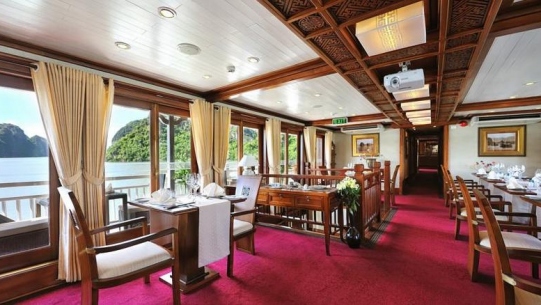 Khu vực nhà hàng và quầy bar nằm trên tầng với hệ thống cửa kính khiến du khách được ngắm nhìn khung cảnh tuyệt đẹp của vịnh Hạ Long. Không gian sang trọng, tiện nghi mang lại cảm giác thoải mái và thư giãn tuyệt đối.