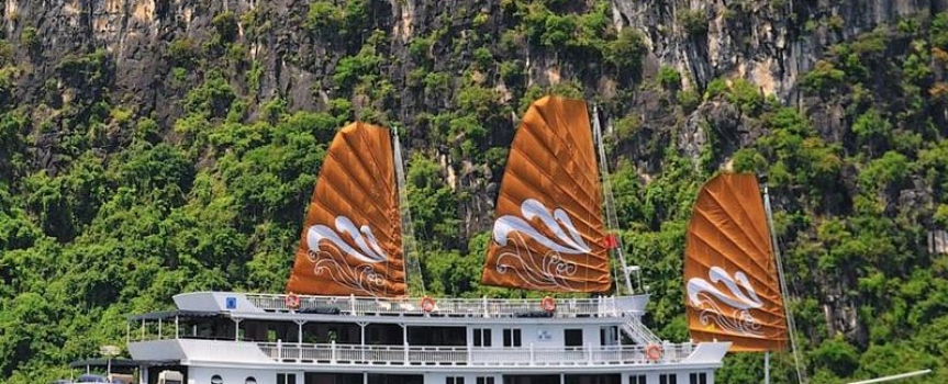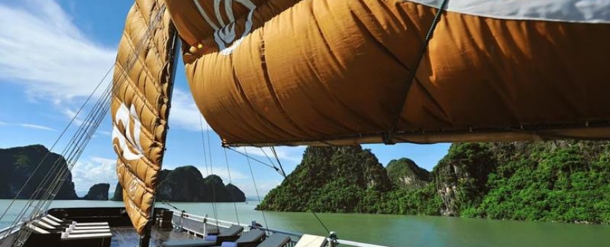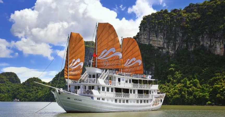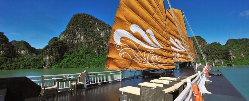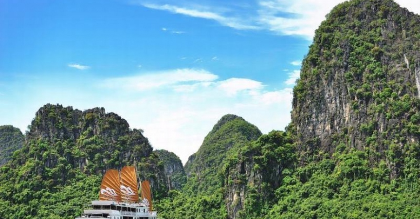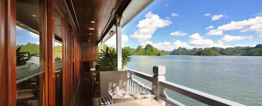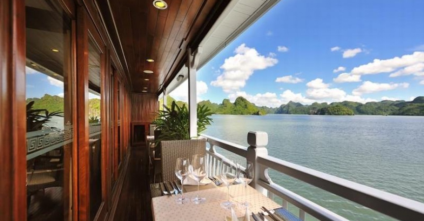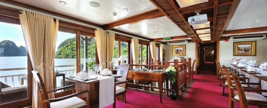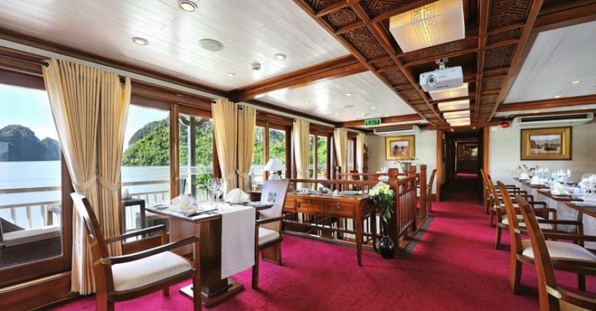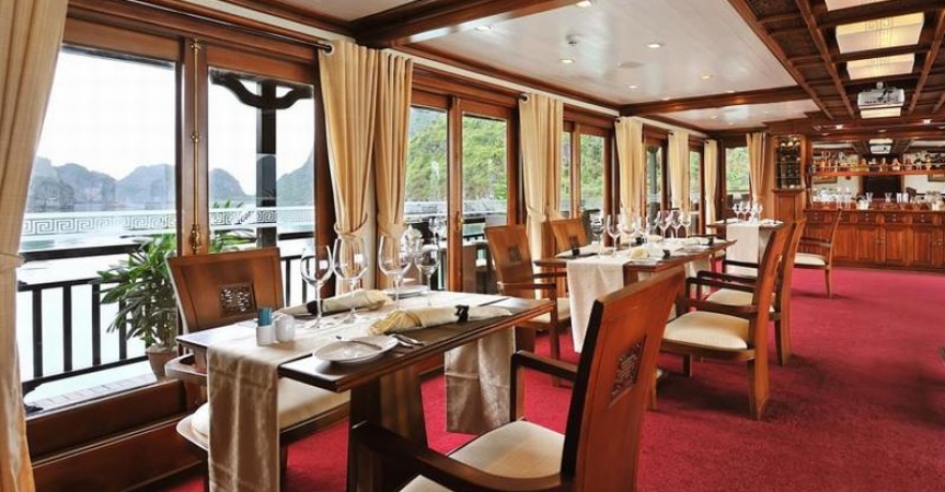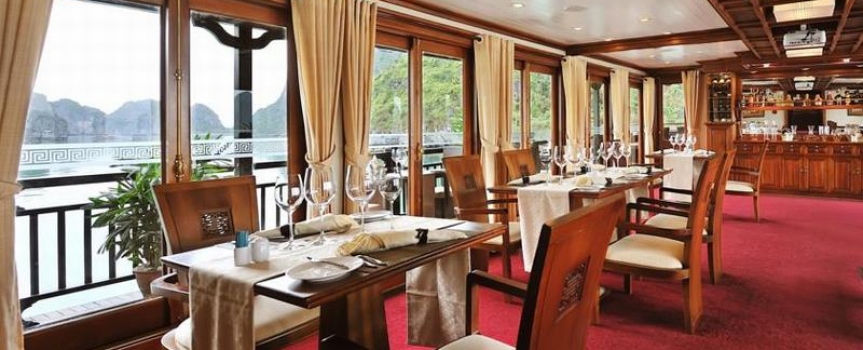 Trong khi tàu rời bến và tiến sâu vào vịnh Hạ Long, du khách sẽ có thời gian thưởng thức bữa trưa thịnh soạn tại nhà hàng và chiêm ngưỡng cảnh đẹp kì vĩ của Di sản Thiên nhiên Thế giới.
