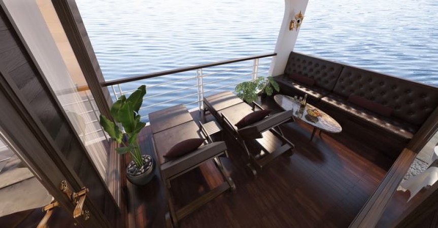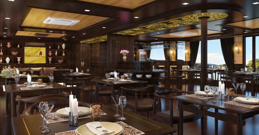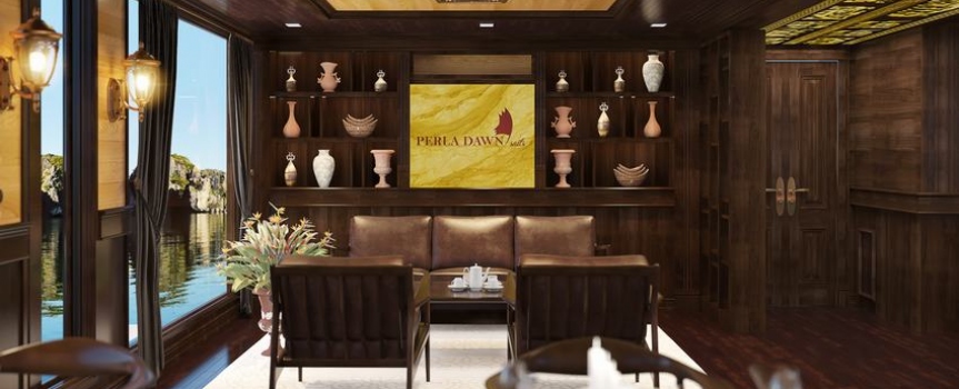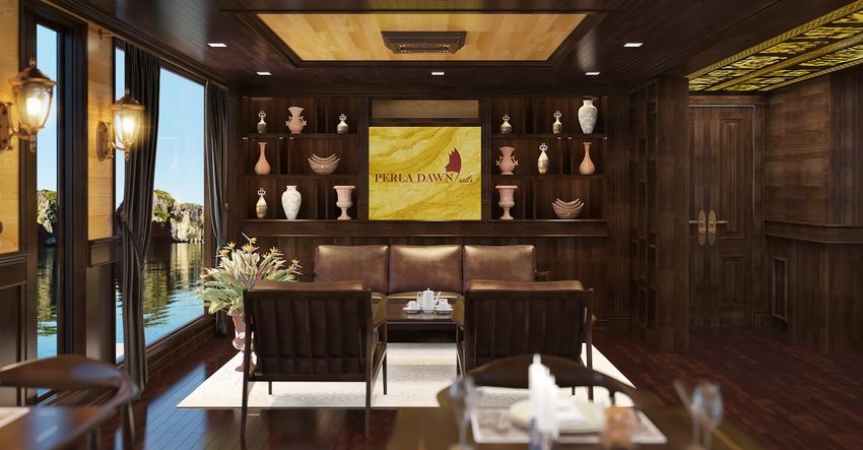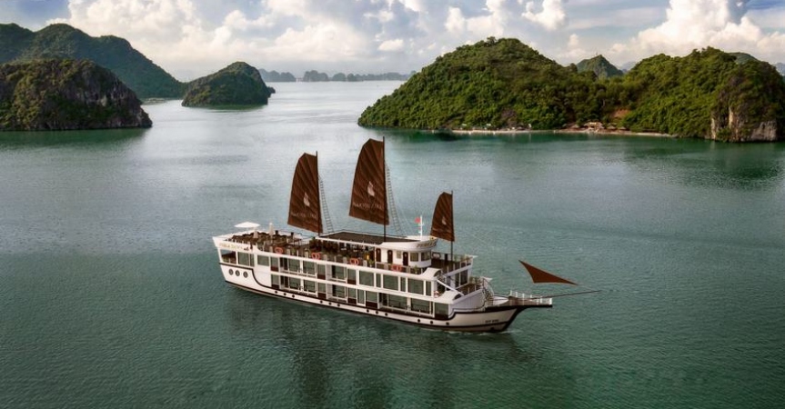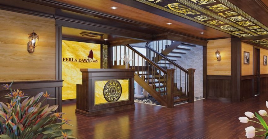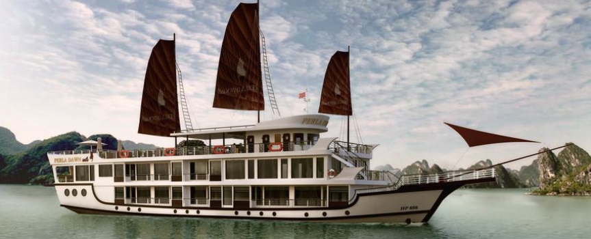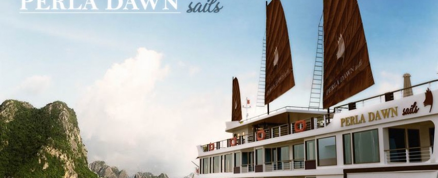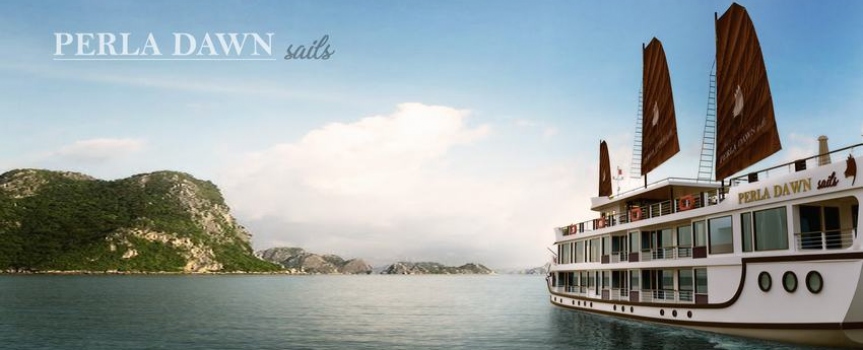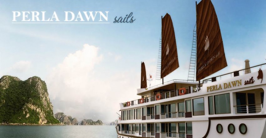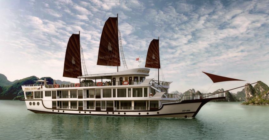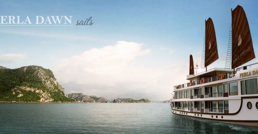 12:00 - 12:30: Khách lên tàu Perla Dawn Sails tại cảng Cát Hải, thưởng thức welcome drink và nghe thông tin chung trước khi khởi hành.