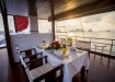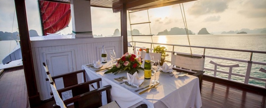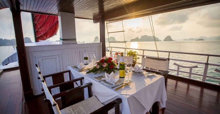 Phòng ăn sang trọng được thiết kế trên tầng 2 của du thuyền, giúp quý khách có thể thoải mái vừa vui chơi, ăn uống, vừa thưởng thức khung cảnh tráng lệ của Vịnh Hạ Long