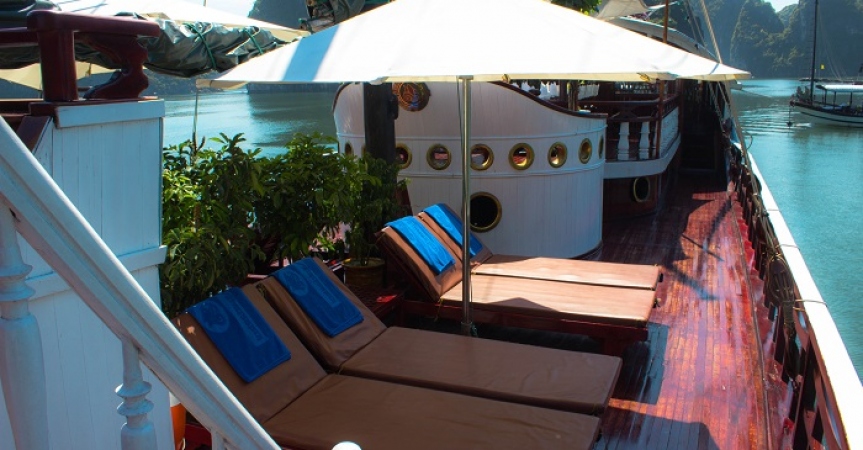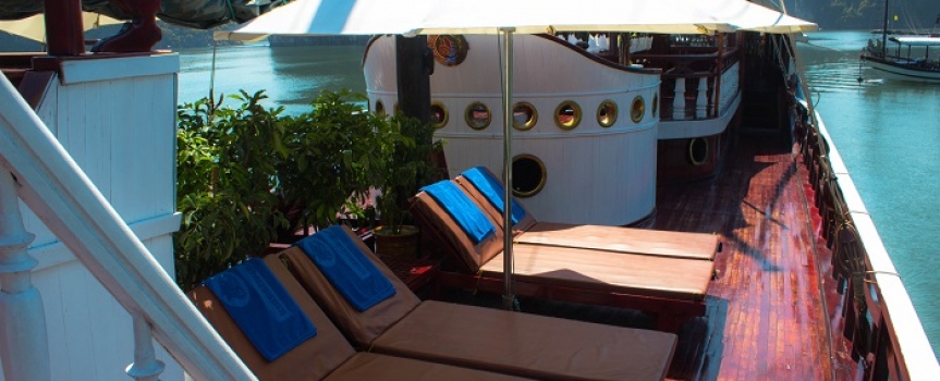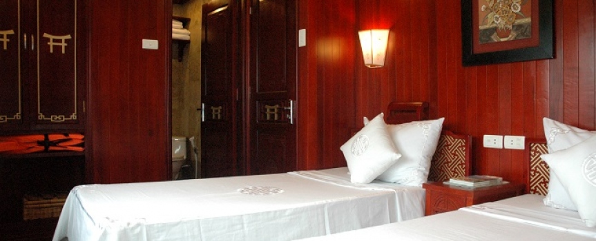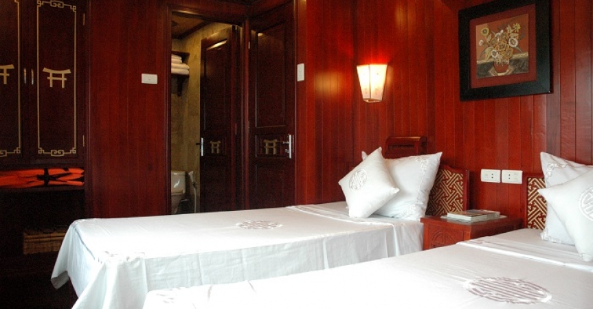 Du thuyền Rồng Đỏ có tất cả năm phòng ngủ và hai tầng trên tàu. Với thiết kế bằng gỗ sang trọng, thanh lịch và cũng không kém phần thoải mái, giúp cho quý khách có thể nghỉ ngơi và vui chơi thư giãn với không gian thoáng đãng, đón gió biển. Quý khách có thể thoải mái ngắm cảnh Vịnh Bái Tử Long tráng lệ trong suốt chuyến đi mà không hề phải lo nghĩ về những vấn đề khác