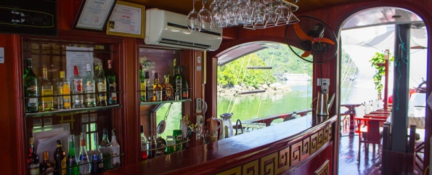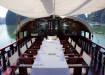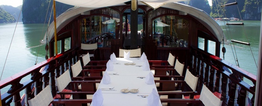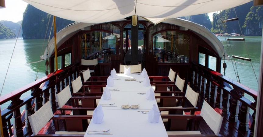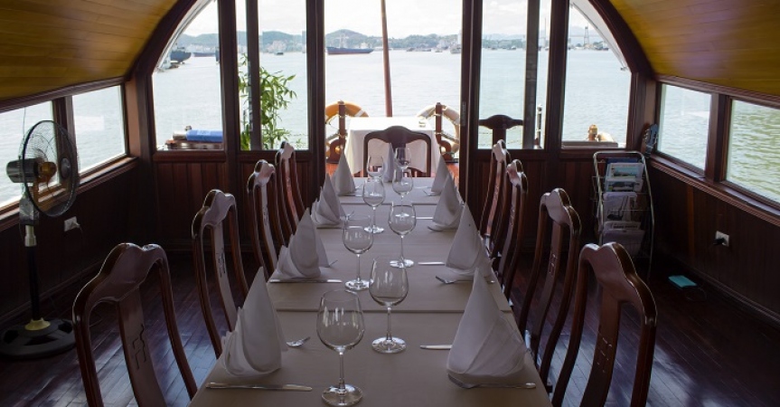 Ngoài một bàn ăn được bày ngoài trời thì Du thuyền Rồng Đỏ còn có một phòng ăn bên trong ở tầng 2 với đầy đủ tiện nghi, sẵn sàng phục vụ cho mọi nhu cầu của quý khách.