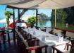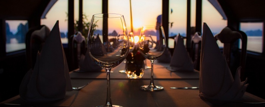 Phòng ăn của Du thuyền Rồng Đỏ được trang trí vô cùng thân mật và ấm áp, với tầm nhìn hướng ra Vịnh, có thể giúp cho bạn vừa ăn uống, nghỉ ngơi cùng gia đình, bạn bè vừa thưởng thức khung cảnh của Vịnh Hạ Long