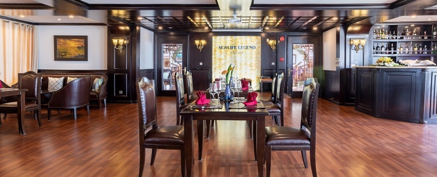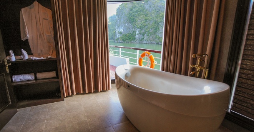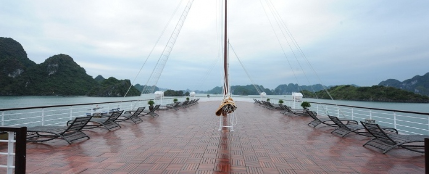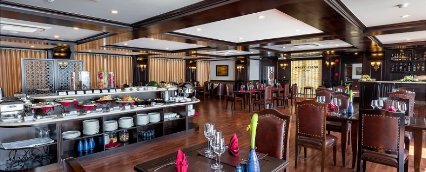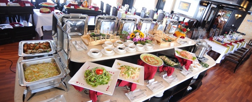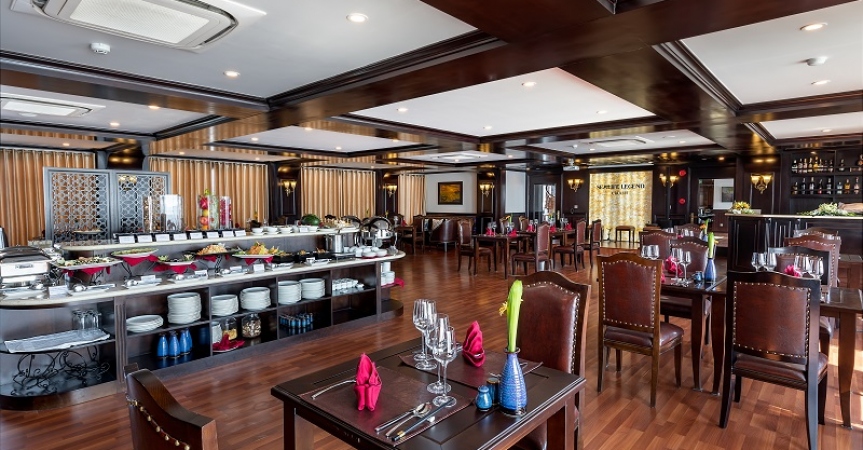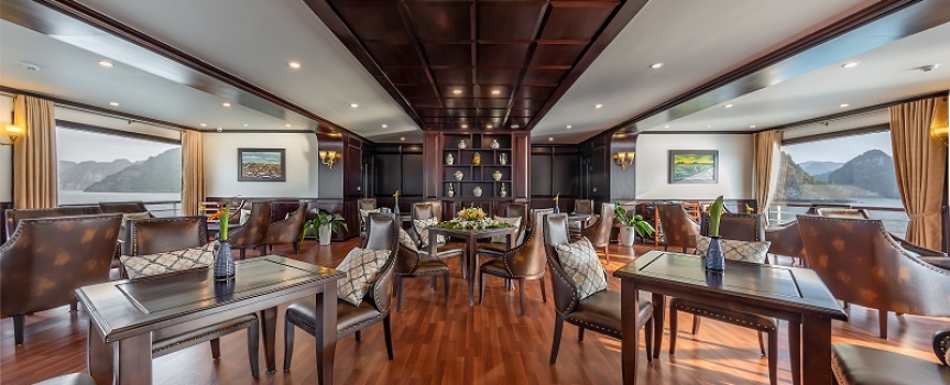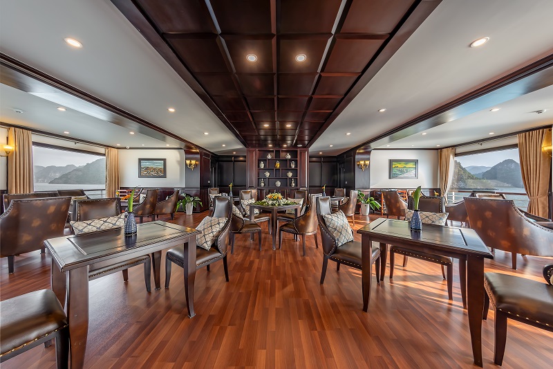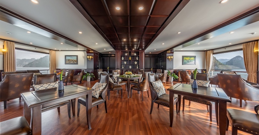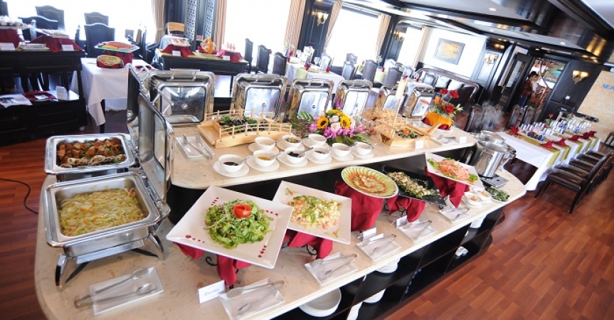 09h30: Đây là thời gian quý khách thu dọn tư trang cá nhân và kiểm tra lại cabin của mình một lần nữa trước khi làm thủ tục trả phòng. Thưởng thức buffet ở nhà hàng Fish Net trong khi thuyền ra khơi quay trở lại bến tàu. Sau bữa tiệc buffet, quý khách có thể lựa chọn tự do thư giãn trên hiên tắm nắng.
