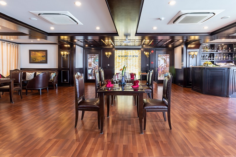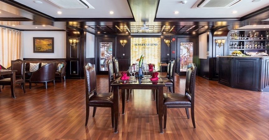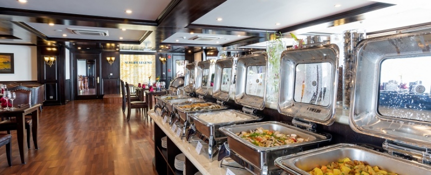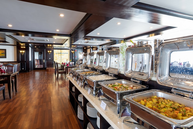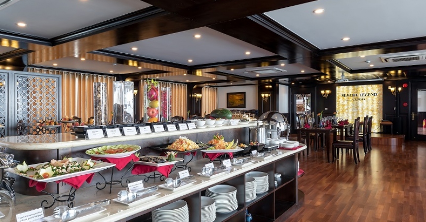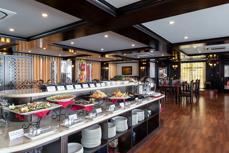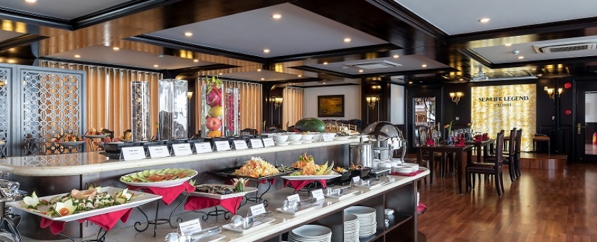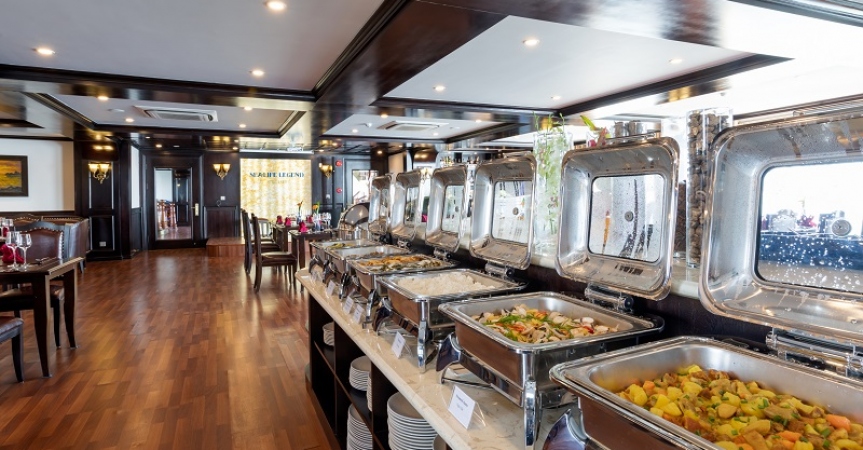 13h15: Bữa trưa đã sẵn sàng để được phục vụ tại Nhà hàng Fish Net trong khi du thuyền Sealife Legend di chuyển đến Vịnh Lan Hạ. Tận hưởng khung cảnh ngoạn mục của những núi đá vôi hùng vĩ nổi lên từ nước biển màu ngọc lục bảo của vịnh Lan Hạ.