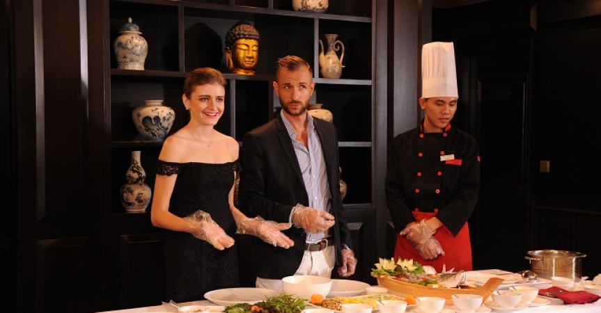 18h00: Sau thời gian thư giãn tại bể sục, quý khách sẽ được chào đón tại buổi trình diễn nấu ăn và có cơ hội nếm thử rượu truyền thống của Việt Nam để tìm hiểu về các món ăn truyền thống do ngư dân làm. Quý khách cùng với bếp trưởng thử tìm hiểu và tự tay làm món “Cá thính” – món đặc sản độc đáo của ngư dân vịnh Hạ Long. Uống rượu và vui chơi theo phong cách địa phương sẽ để lại những kỷ niệm thực sự khó quên trong chuyến đi của quý khách.