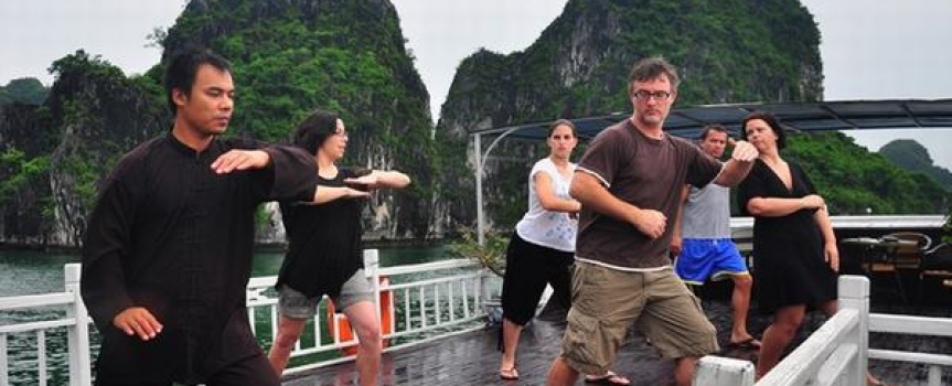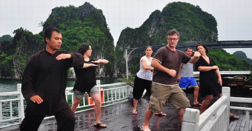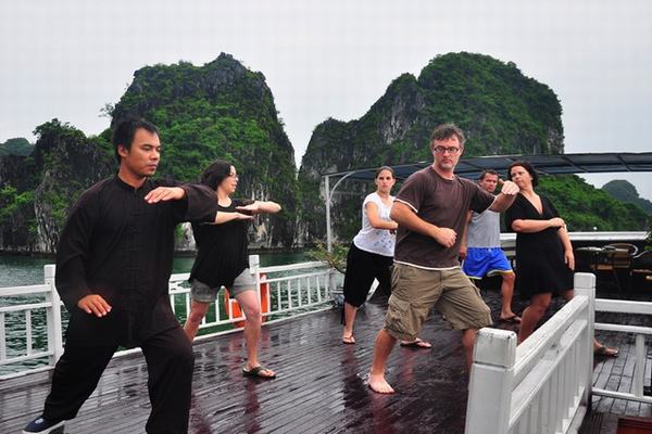 06:30: Chào ngày mới với bài tập taichi – đây là một phương pháp dưỡng sinh tuyệt diệu, vừa giúp cho cơ thể khỏe mạnh, trẻ trung, vừa giúp hệ thần kinh thư thái giữa không gian hung vĩ của vịnh buổi sớm mai. Bạn cũng có thể bạn có thể vừa thưởng thức trà, cafe vừa ngắm cảnh đẹp trên vịnh từ boong tàu.