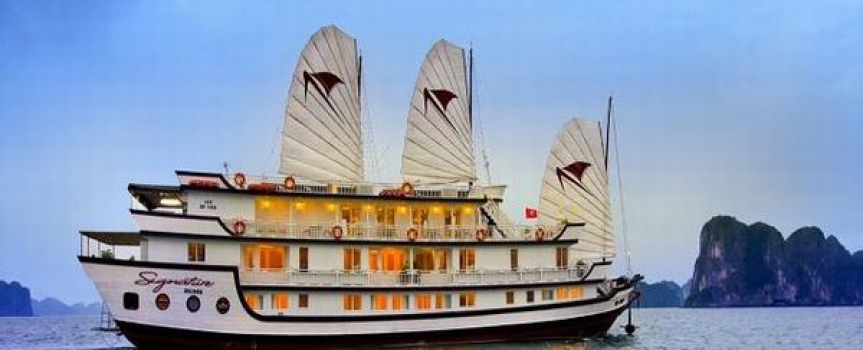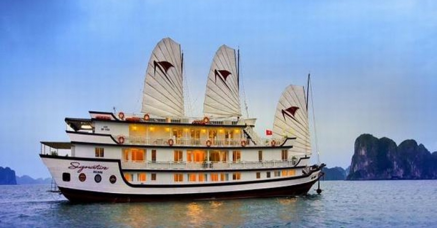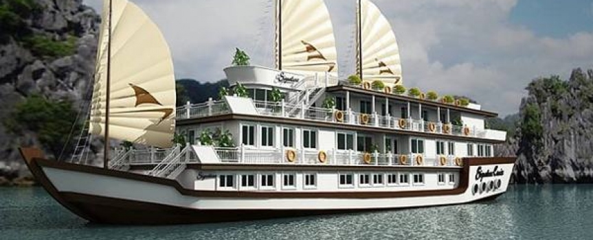 12:30: Đến bến tàu Hạ Long, quý khách bắt đầu hành trình du ngoạn khám phá vẻ đẹp của vịnh trên du thuyền sang trọng Signature Hạ Long Cruise. Qúy khách sẽ được thưởng thức đồ uống chào mừng trên tàu trong khi quản lý tàu giới thiệu về lịch trình trên tàu và làm thủ tục nhận phòng. Qúy khách sẽ có cơ hội thăm quan tàu hoặc ngắm cảnh vịnh.