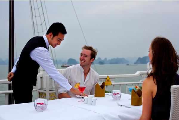 13:15: Trong khi du thuyền bắt đầu hành trình thăm vịnh, bữa ăn trưa đặc biệt với hải sản tươi sống và các món ăn ưa chuộng sẽ được phục vụ. Từ nhà hàng trên du thuyền sang trọng này bạn có thể vừa thưởng thức các món ăn ngon vừa có thể ngắm cảnh vịnh.