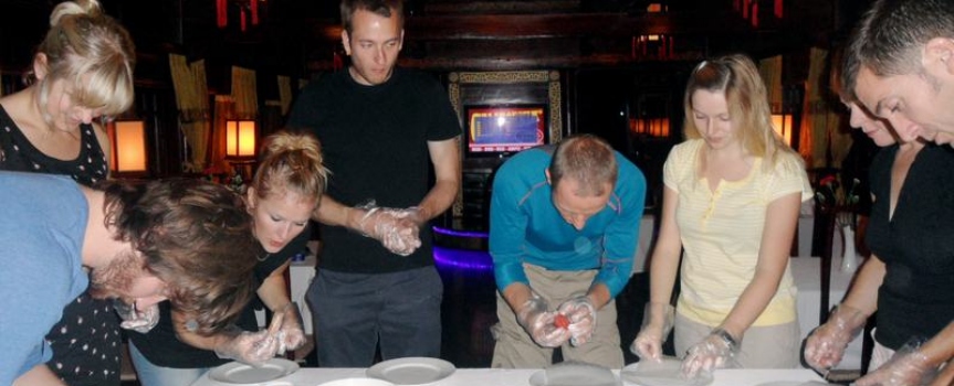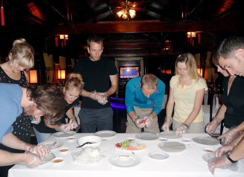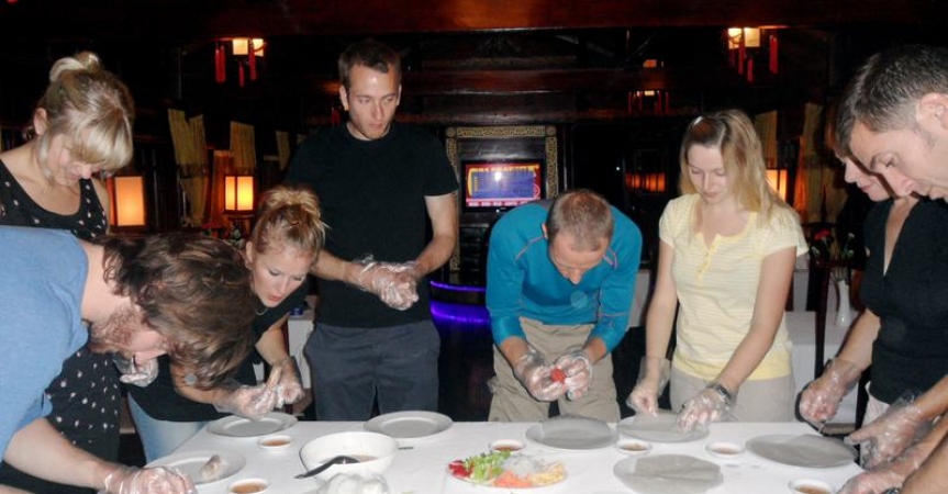 Quý khách tham gia lớp học nấu ăn, học cách làm nem cuốn trước khi bữa trưa được phục vụ.