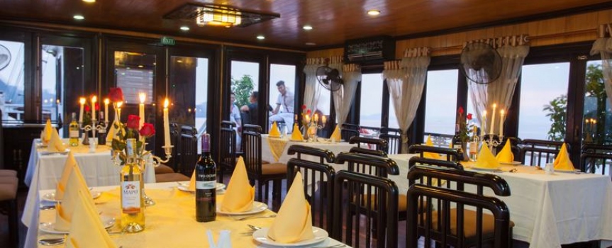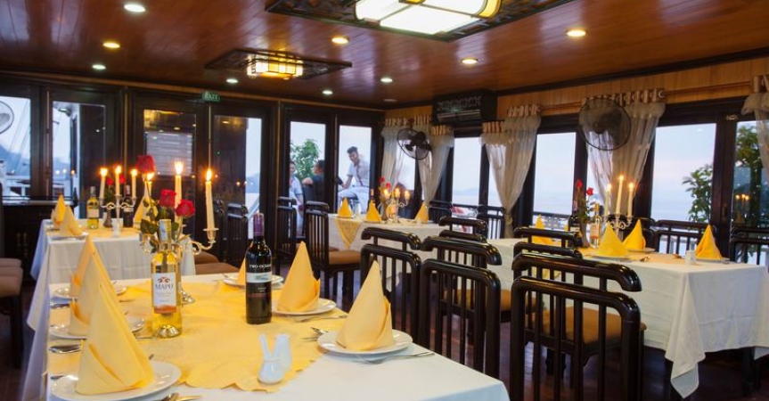 Khu nhà hàng và quầy bar của Việt Beauty được thiết kế rất rộng rãi, có tầm nhìn tuyệt vời ra cảnh biển xung quanh và không gian lãng mạn. Du khách được thỏa thích thưởng thức những món hải sản tươi ngon được đánh bắt từ biển Hạ Long hay những thức đồ uống mát lành được pha chế những batender chuyên nghiệp.