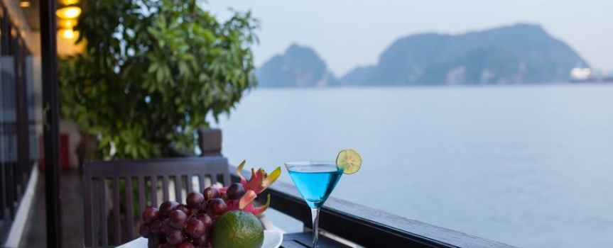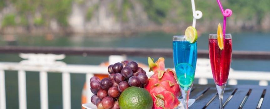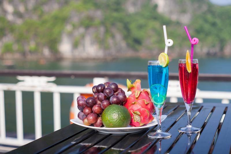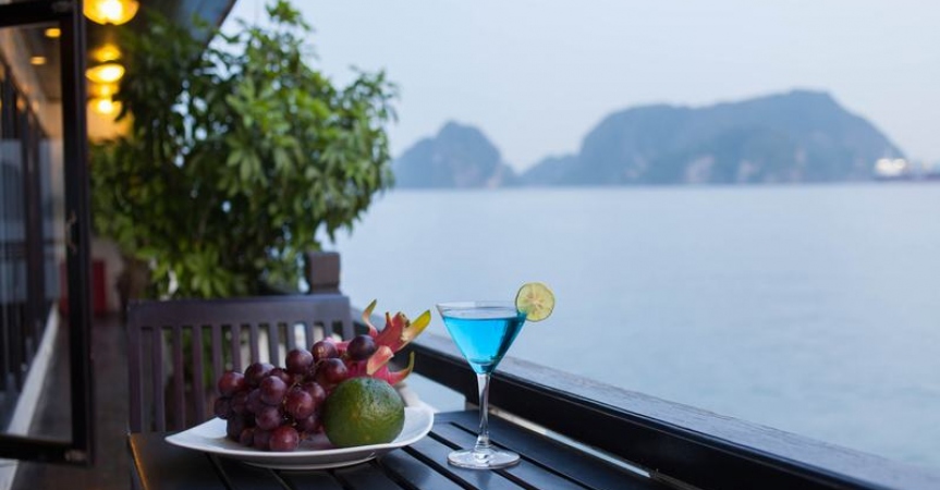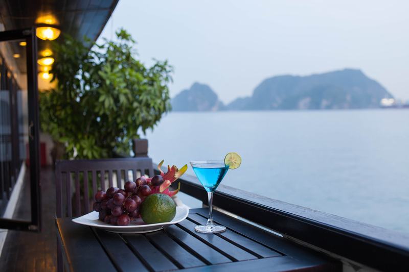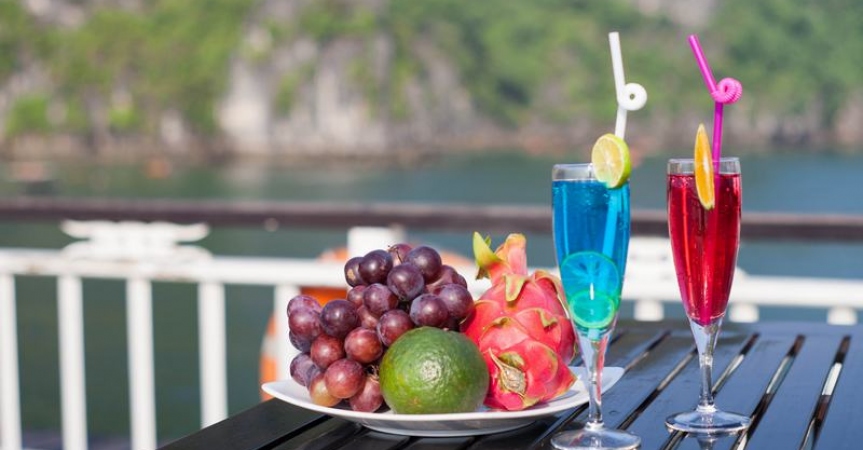 Quý khách tham gia Sunset Party trên boong tàu với rượu và trái cây tươi.