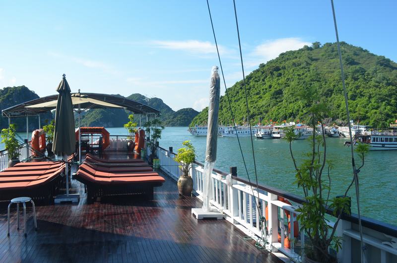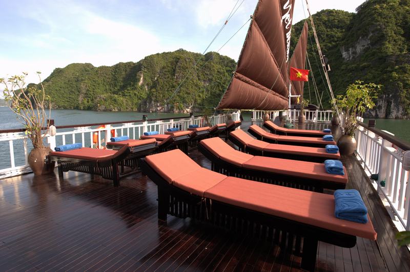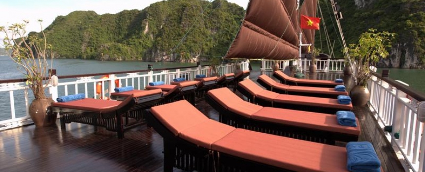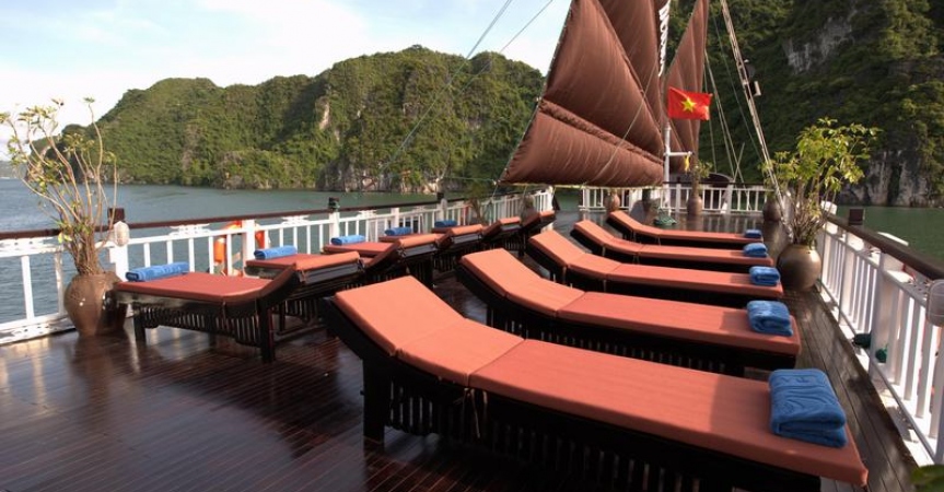Khu vực sundeck có ghế nằm tắm nắng và bàn ngồi ngắm cảnh. Thật tuyệt vời khi buổi sáng thức giấc ra sundeck ngồi ngắm bình minh lên trên mặt vịnh hay tập thể dục thái cực quyền.