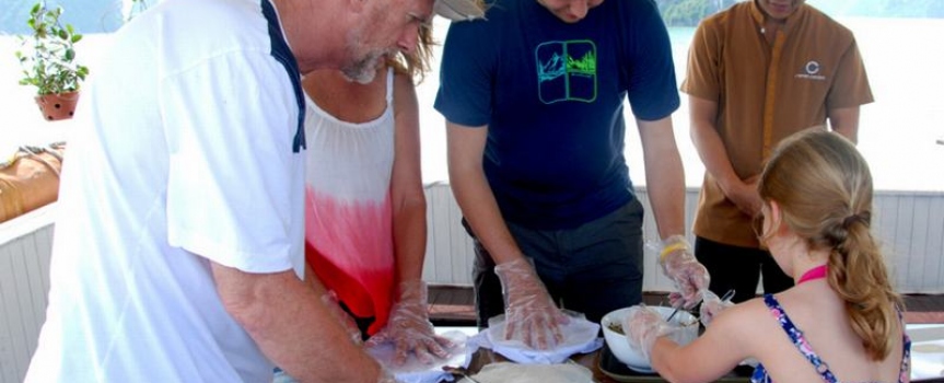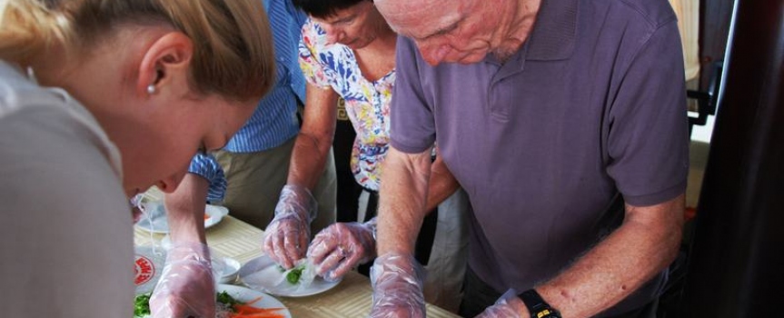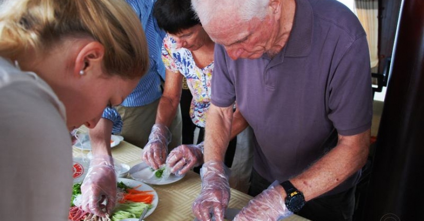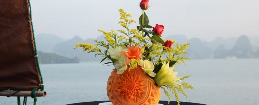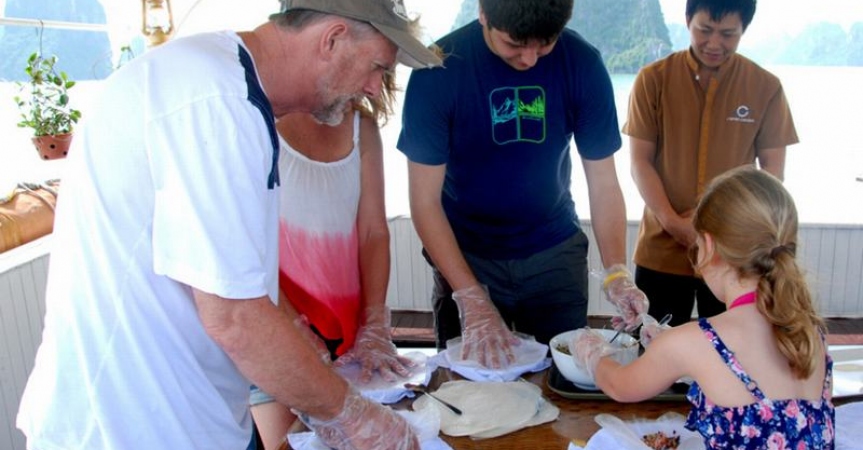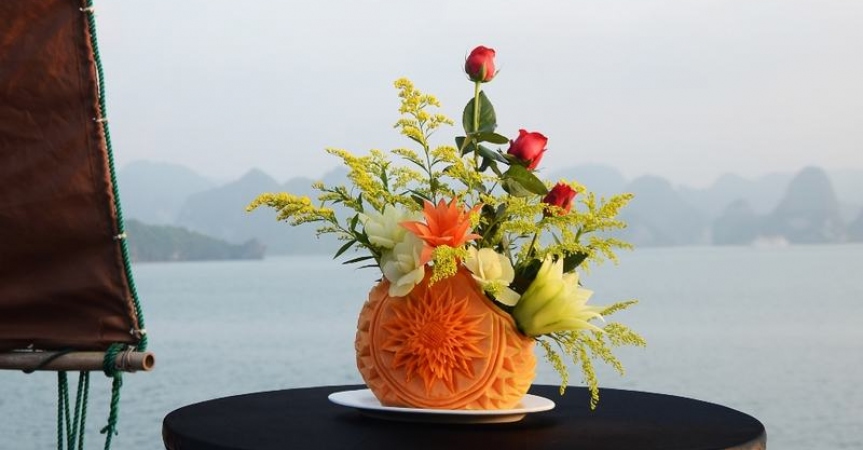 10h30 – 11h30 Trong lúc tàu di chuyển về cảng, khách sẽ được thưởng thức màn trình diễn cắt tỉa hoa quả điệu nghệ và tham gia lớp học nấu ăn cùng bếp trưởng với những món cuốn đơn giản mà sau đó khách có thể tự làm tại nhà. Sau đó khách sẽ có bữa trưa với những món ăn truyền thống Việt Nam.