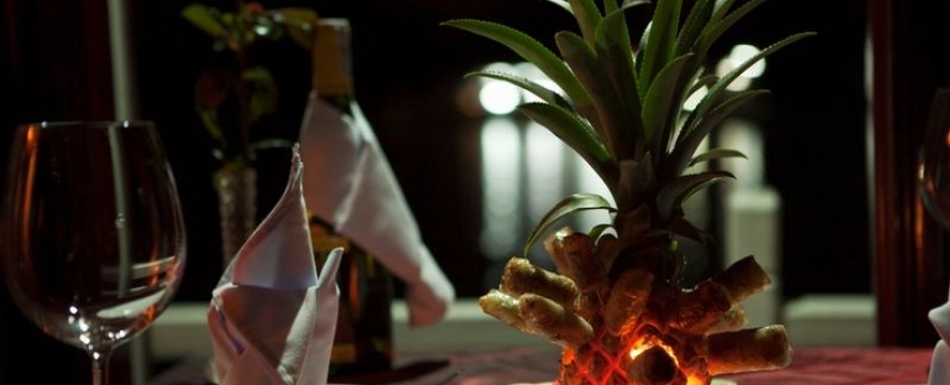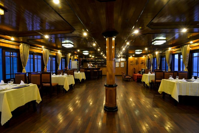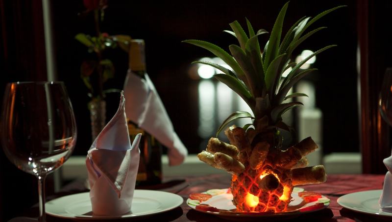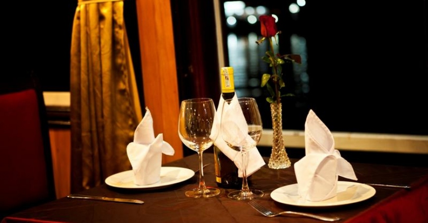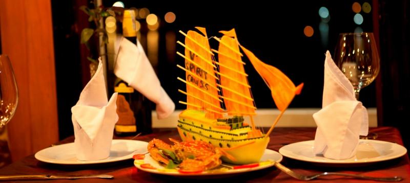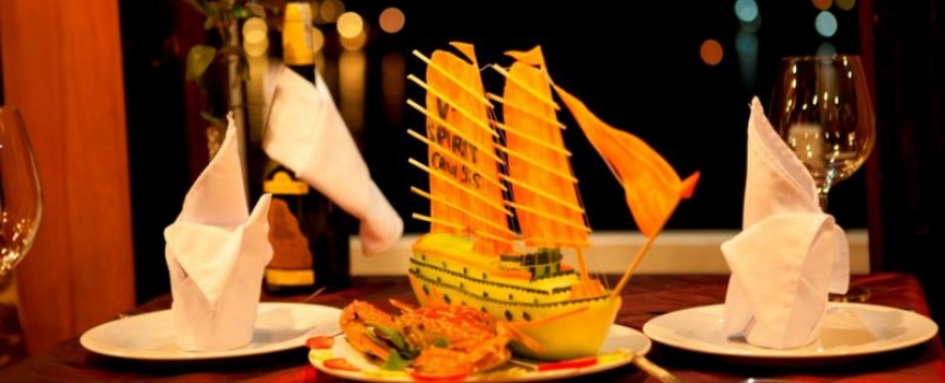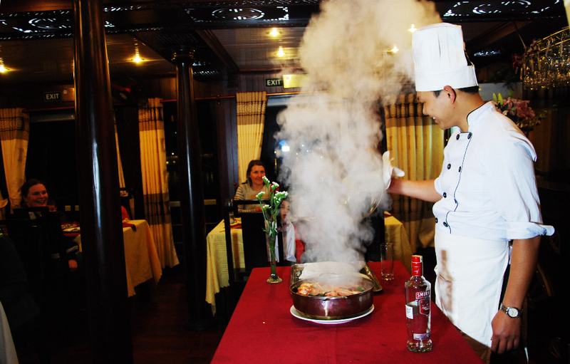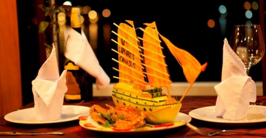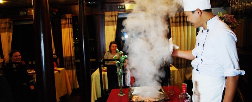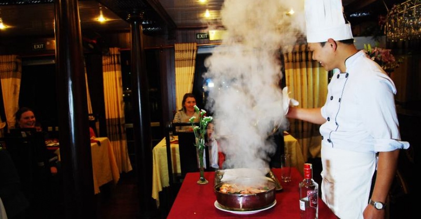 19h00 Bếp trưởng sẽ có một màn trình diễn ẩm thực độc đáo, khách sau khi chiêm ngưỡng có thể thưởng thức trực tiếp. Sau đó bữa tối sẽ được phục vụ trên thuyền với những món ăn mang phong vị truyền thống đậm chất Việt Nam.