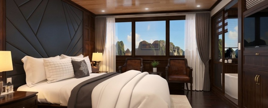12:45 Quý khách lên tàu nhận phòng, thưởng thức Coctail chào mừng và nghe Quản lý tàu giới thiệu thông tin an toàn hành trình trong khi tàu rời bến hướng về phía vịnh Bái Tử Long.