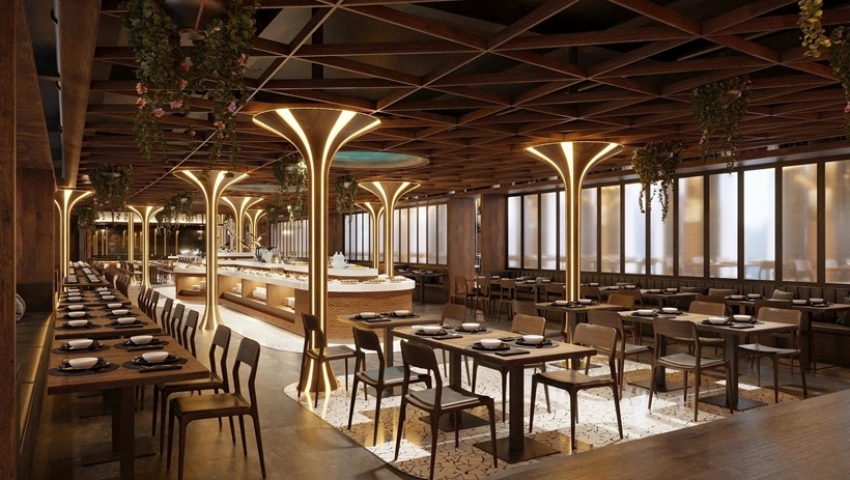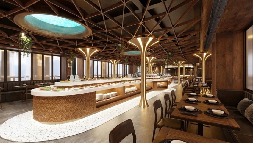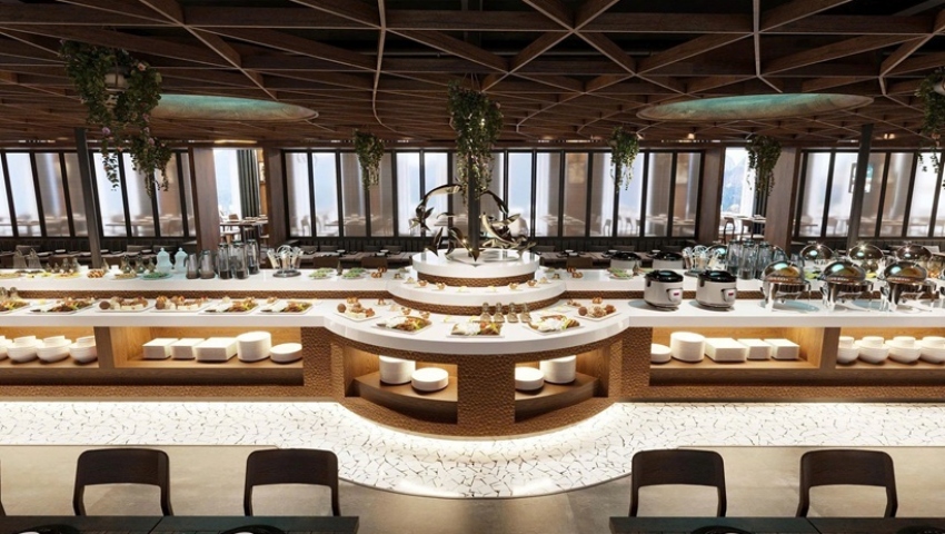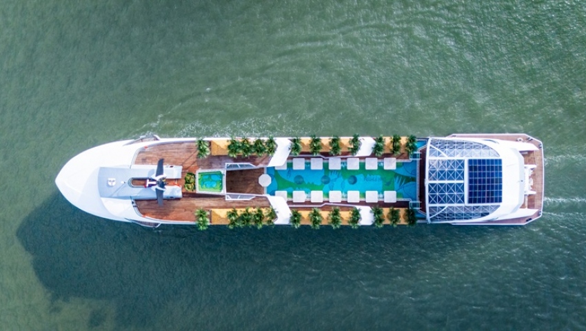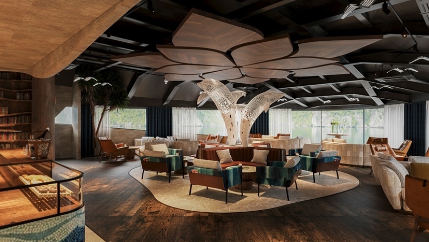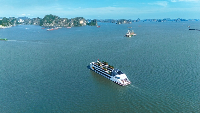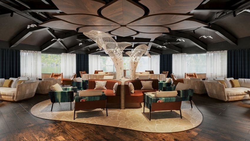 Không chỉ ấn tượng bởi hệ thống Bungalow mái che giật gấp độc đáo, du thuyền còn sở hữu nhà hàng sang trọng diện tích 700m², với bếp mở đầu tiên và lớn nhất vịnh, sức chứa 600 khách và buffet gần 100 món đa dạng từ Á đến Âu – một “thiên đường ẩm thực” thực thụ giữa vịnh biển.