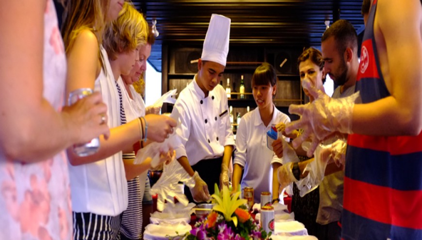 18h30: Quý khách sẽ tham gia lớp học nấu ăn do đầu bếp của chúng tôi trình bày, hướng dẫn du khách làm món nem cuốn.