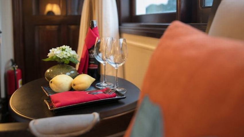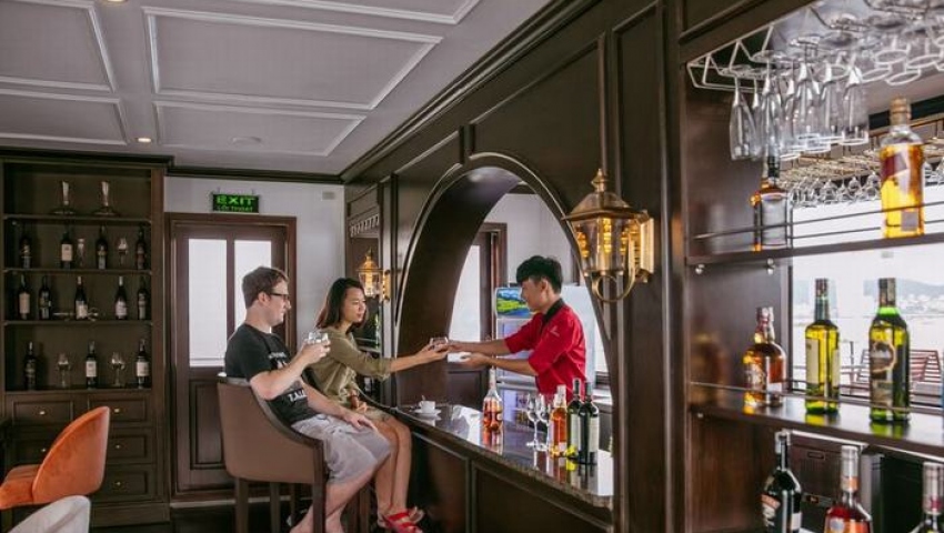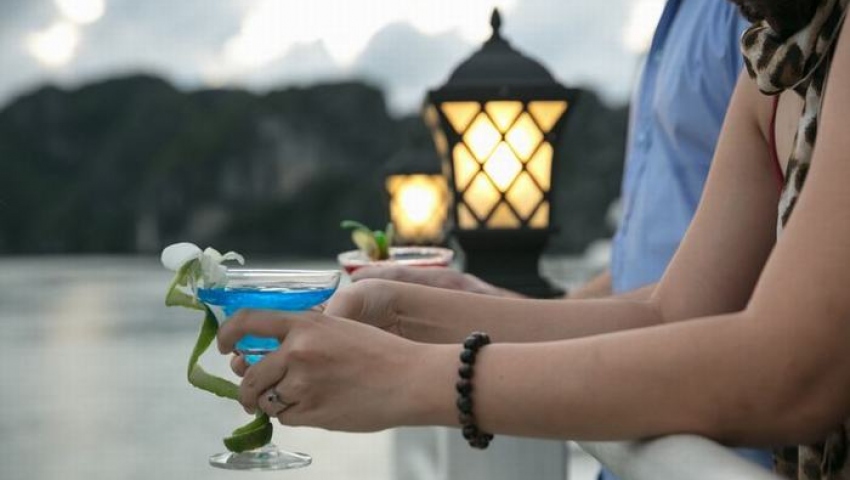 12:15 – 12:30: Qúy khách lên tàu, sẵn sàng hành trình khám phá Hạ Long. Quý khách sử dụng đồ uống chào mừng trên tàu trong khi quản lý tàu thông báo chương trình, hướng dẫn các quy định an toàn trên tàu. Làm thủ tục nhận phòng, tàu rời bến bắt đầu chương trình thăm Vịnh.