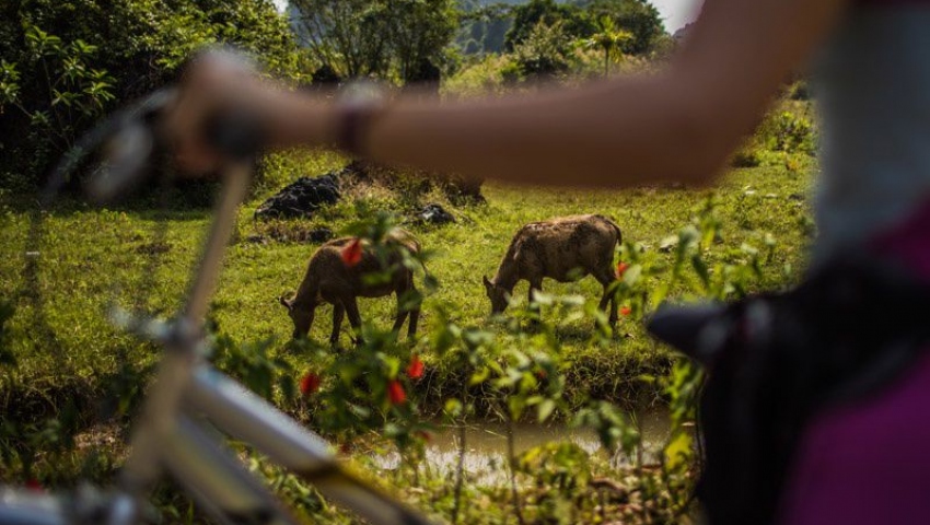 8:30 Chuyển sang xuồng cao tốc để đến thăm làng Việt Hải. Cùng đạp xe tới cánh đồng lúa thông qua một đường hầm rừng nhiệt đới. Thăm quan ngôi nhà truyền thống tại một ngôi làng nằm sâu trong Vườn quốc gia nơi bạn có thể quan sát cuộc sống của người dân địa phương. Bạn sẽ ăn trưa tại một nhà hàng trong làng Việt Hải và sau đó trở lại Du thuyền để đi thăm vịnh Bái Tử Long.