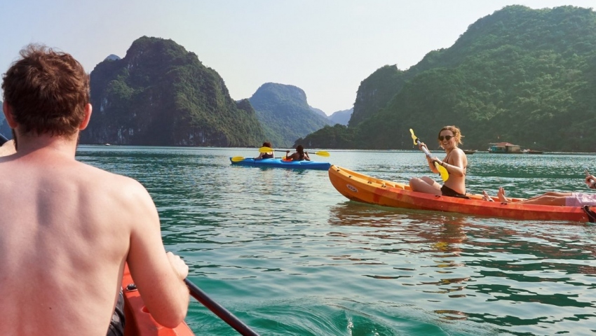 13:30 Ở Vịnh Bái Tử Long bạn có thể đi thuyền nan, chèo Kayak hay bơi ở khu vực hồ Ba Hầm nơi có vách đá dốc đứng (nếu thời tiết thuận lợi).