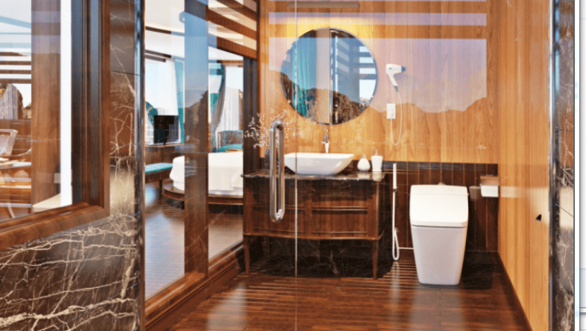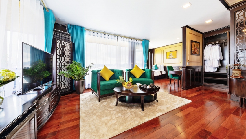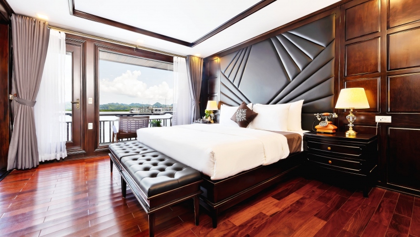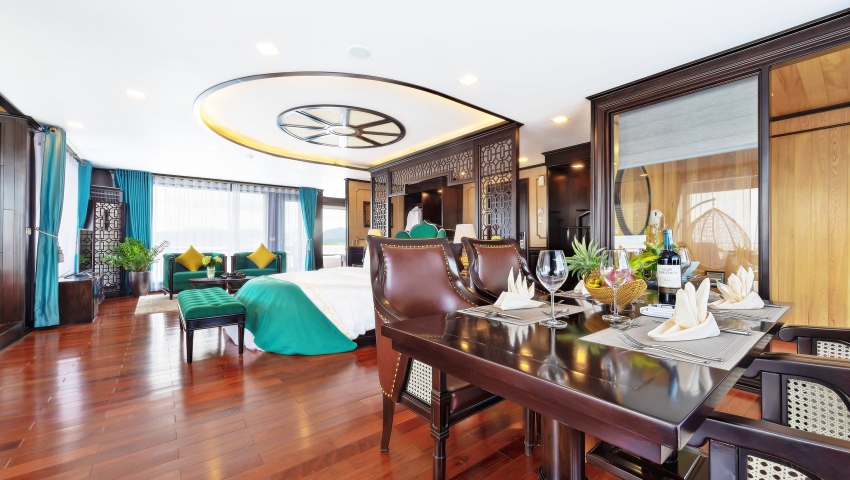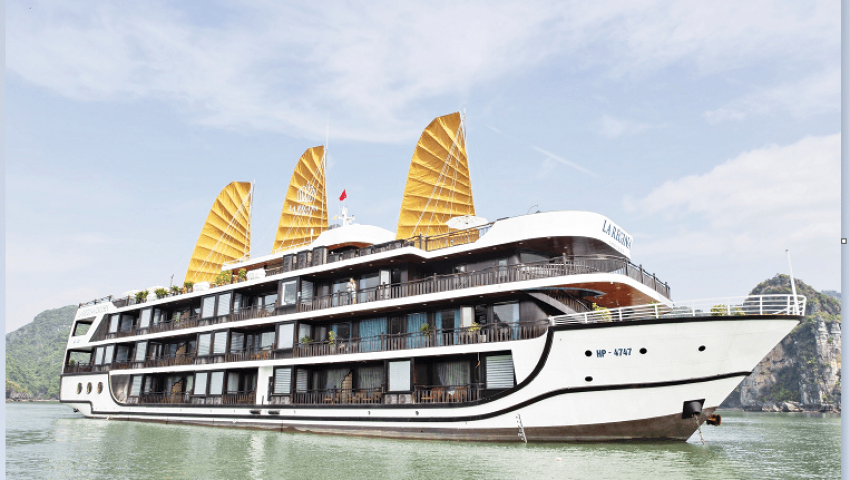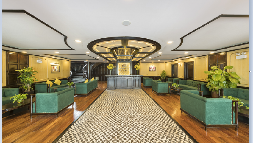 12h30: Quý khách lên tàu nhận phòng, thưởng thức Cocktail chào mừng và nghe Quảnlý tàu giới thiệu thông tin an toàn hành trình trong khi tàu khởi hành đi vịnh Lan Hạ.