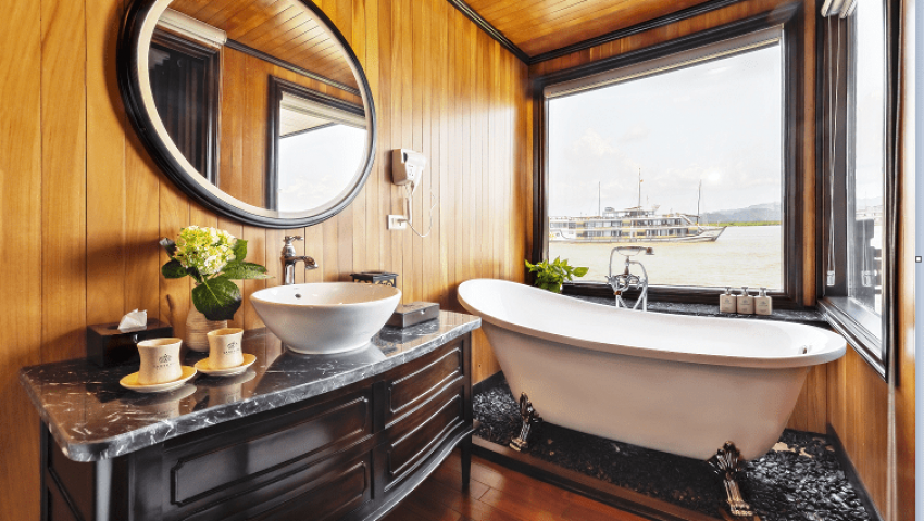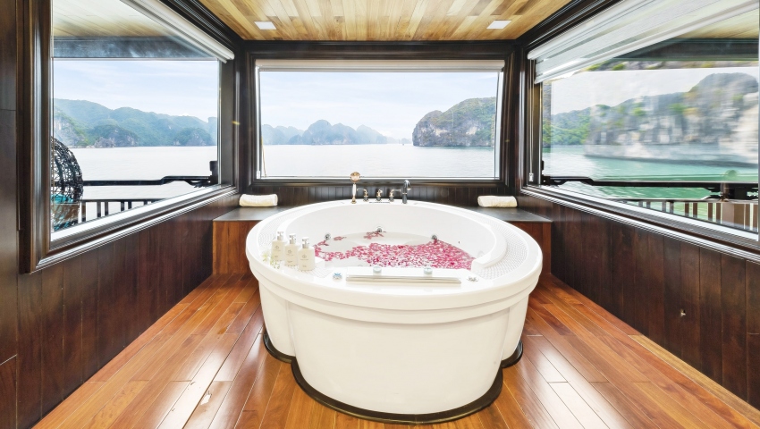 17h30 - 19h00: Quý khách trở về tàu nghỉ ngơi thư giãn, ngắm hoàng hôn trên vịnh và tham gia chương trình “Giờ Hạnh Phúc” – Giảm giá 30% đồ uống trên tàu.