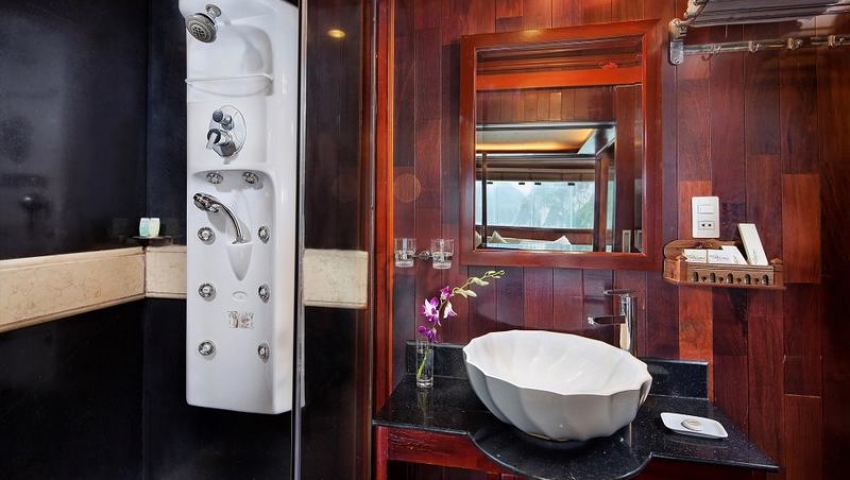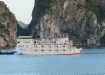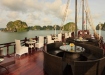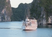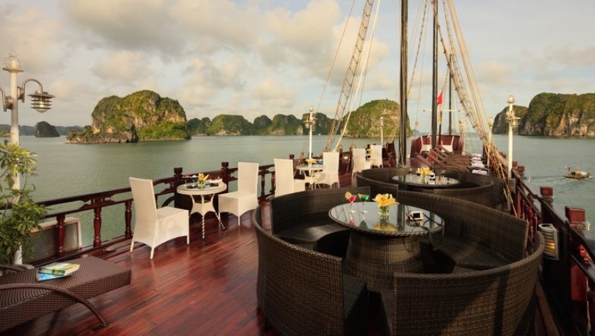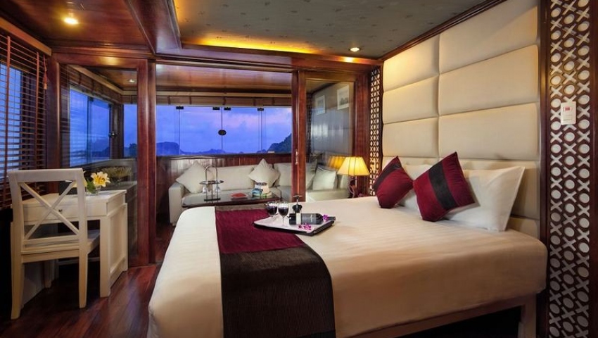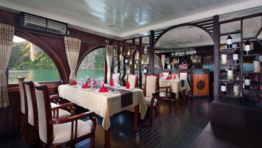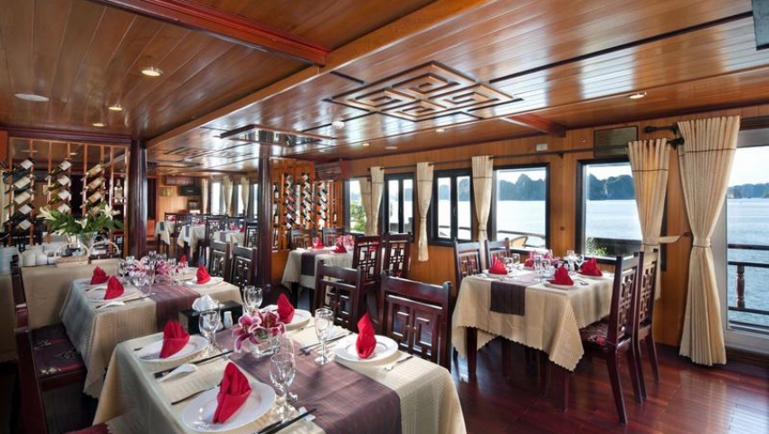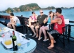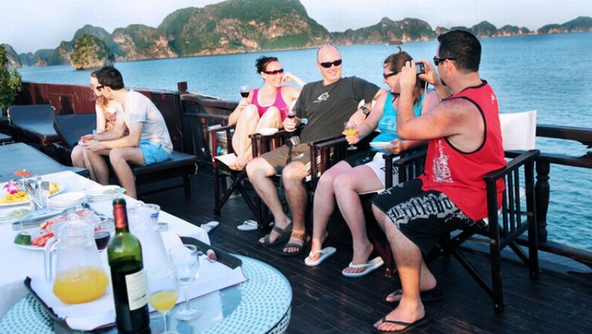 13h15: Phục vụ khách ăn trưa trên đường thăm vịnh. (Dịch vụ massage bắt đầu sau giờ ăn trưa và trong suốt thời gian còn lại trên tàu)