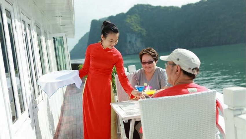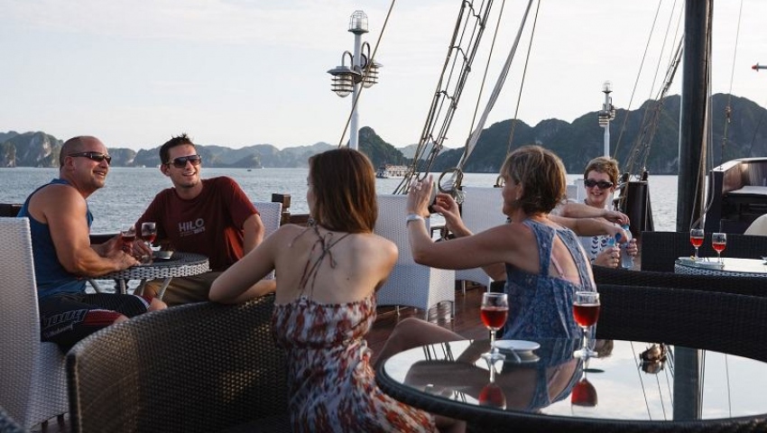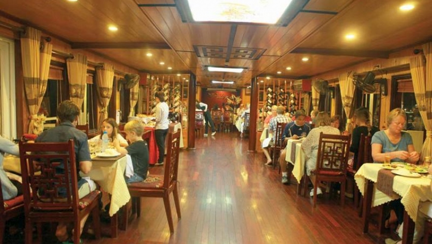 19h15: Phục vụ khách ăn tối trên thuyền.