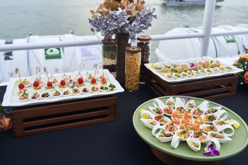 10.00: Quý khách lên Du thuyền Paradise Delight - du thuyền nhà hàng 5 sao cao cấp nhất Vịnh Hạ Long phục vụ ẩm thực đa dạng. Hãy bắt đầu hành trình với bữa tiệc Canapé cùng đồ uống chào mừng trong âm nhạc acoustic êm ái.