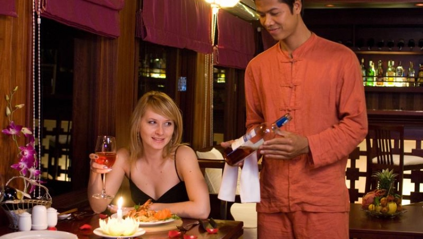 12h15 : Quý khách được chở từ bến sang Du thuyền Valentine bằng xuồng. Khi lên đến Du thuyền quý khách sẽ được thưởng thức đồ uống chào mừng và hướng dẫn trên du thuyền sẽ thông báo về lịch trình và các qui định về an toàn trên tàu.