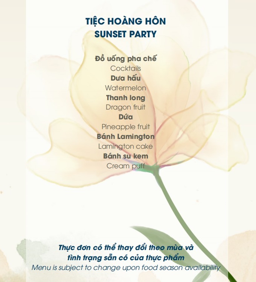 - Tiệc hoàng hôn với miễn phí 1 ly cocktails/ khách, bánh ngọt, quả.