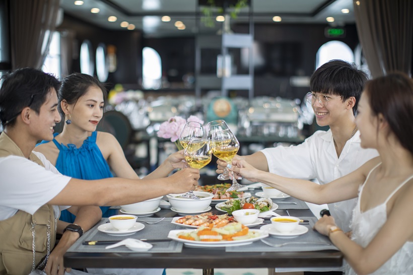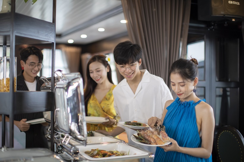 12:30- 13:30 Quý khách check-in lên tàu, thưởng thức bữa trưa (Buffet Hải sản hoặc Set Menu: phục vụ buffet khi có 18 khách trên thuyền trở lên).